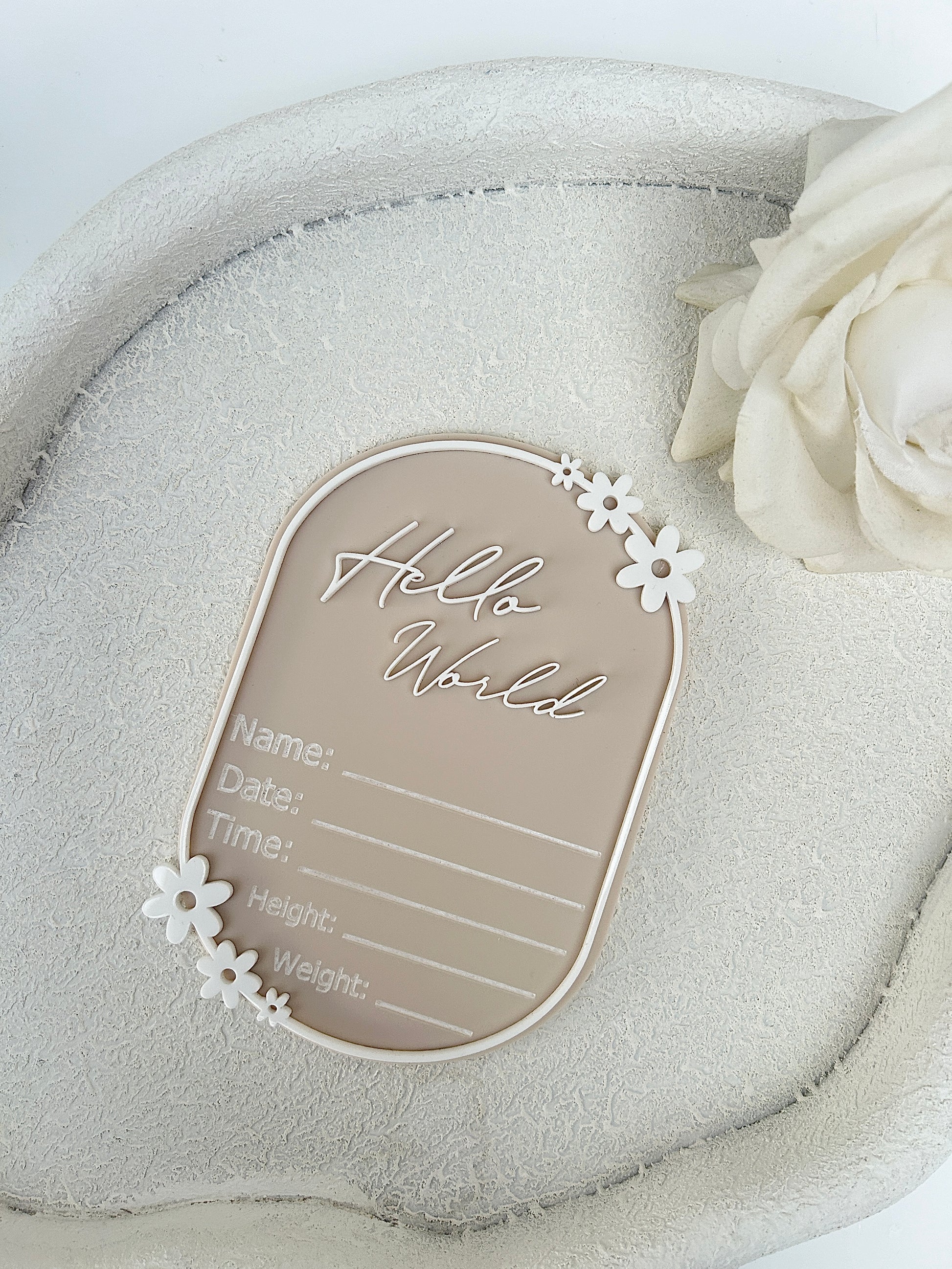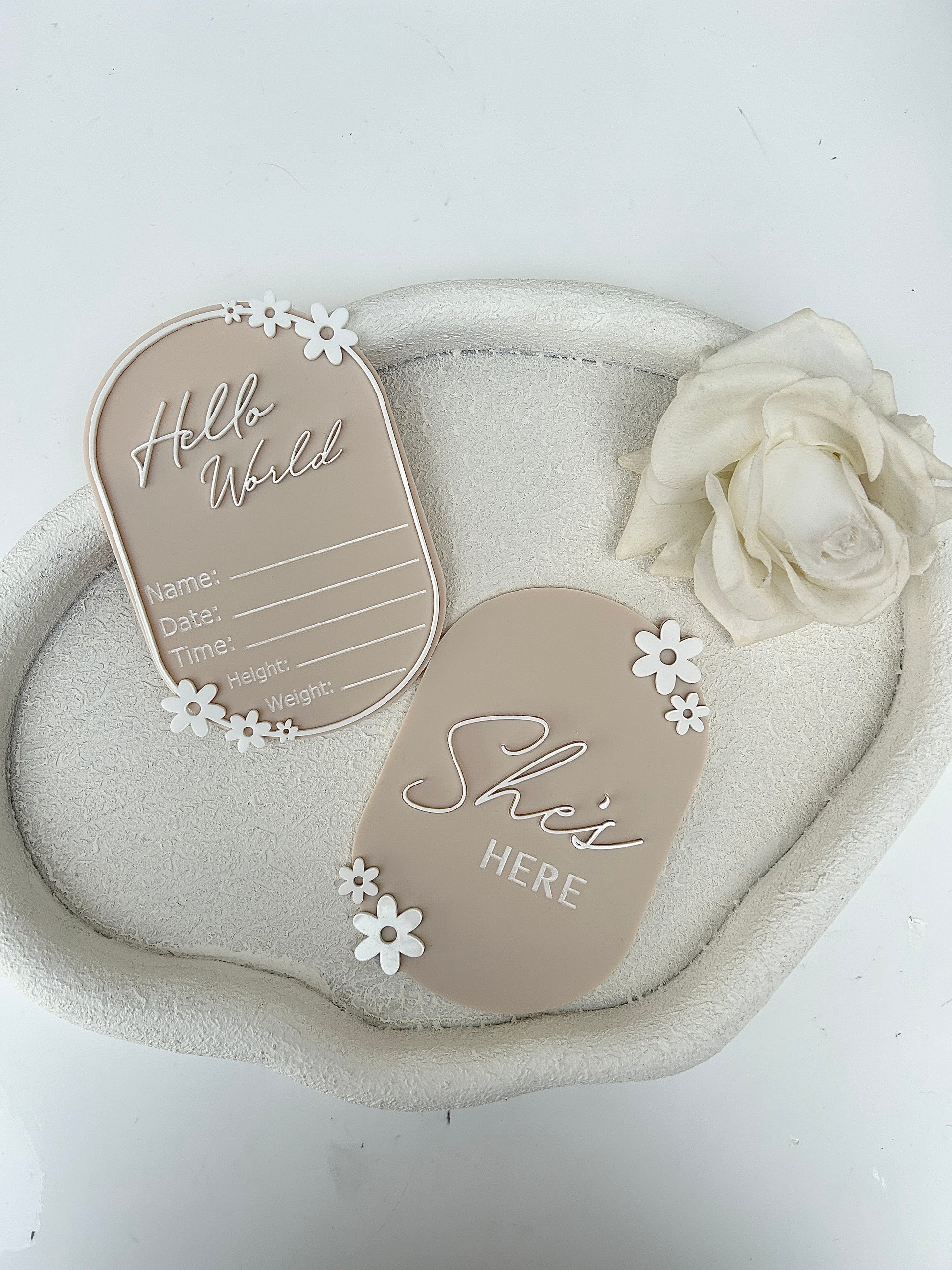 Welcome your little one into the world with our combo of oval shaped ‘she’s here’ disc and a ‘hello world’ disc which has a ‘details’ part where you can write all your little ones information.