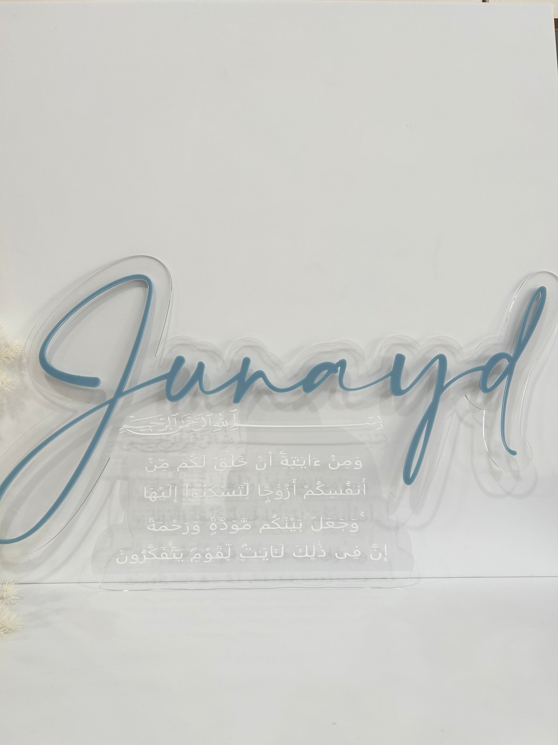 Lagreed name plaque with Ayat Al Kursi engraved and painted on at the bottom.