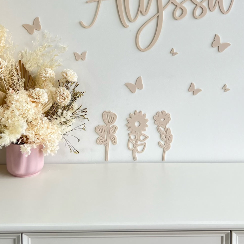 Our set of 3 stem flowers are the perfect accessory to add to your wall space on top of a dresser to give the illusion of the growing effect.