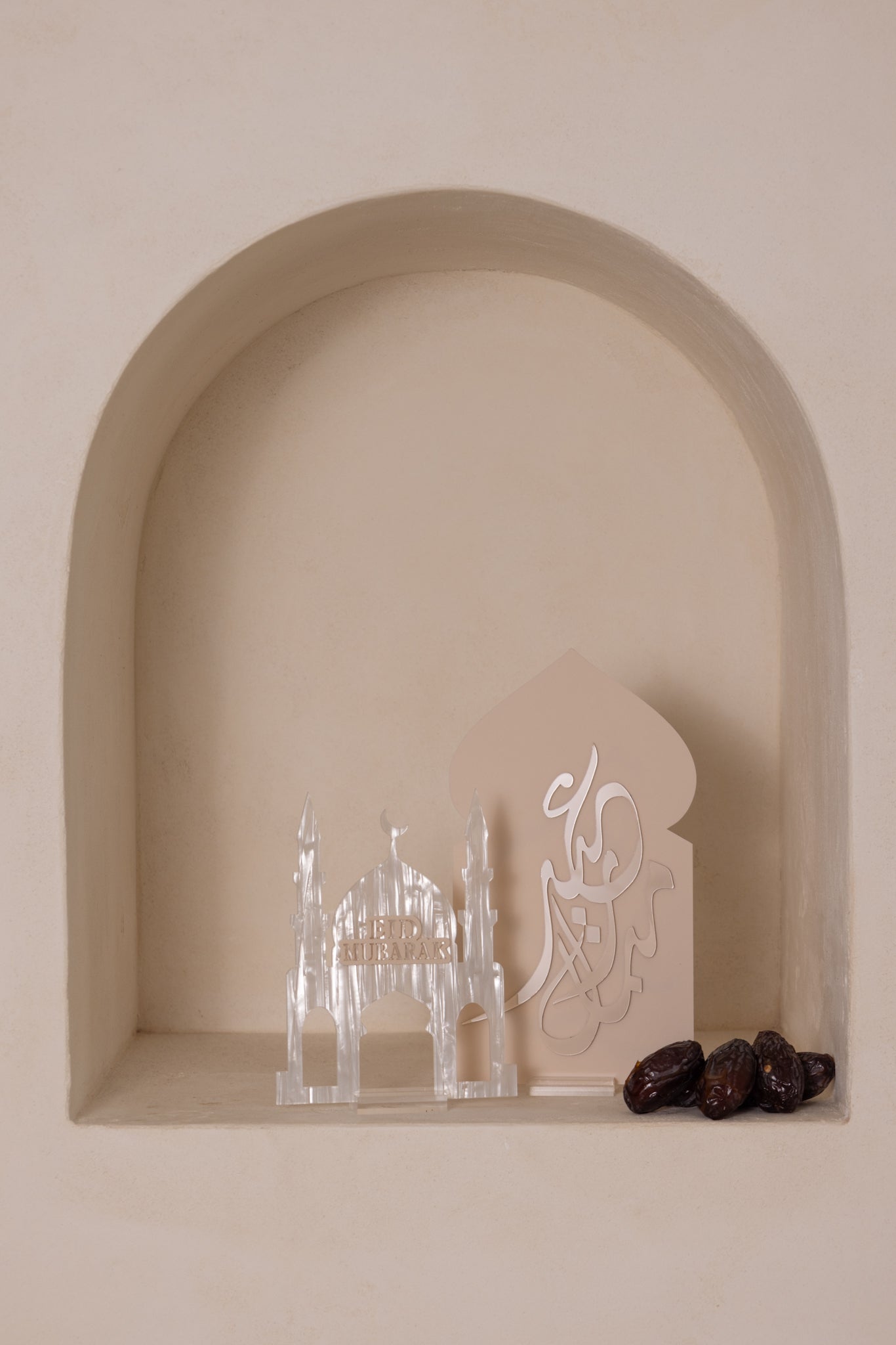 A monochromatic double sided stand featuring the wording 'Ramadan Mubarak' on one side and 'Eid Mubarak' on the other. This also includes a mosque silhoutte with 'Ramadan Mubarak' and 'Eid Mubarak' on either side of the mosque used as a translation to the arabic writing.