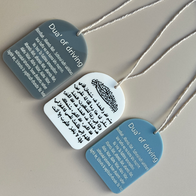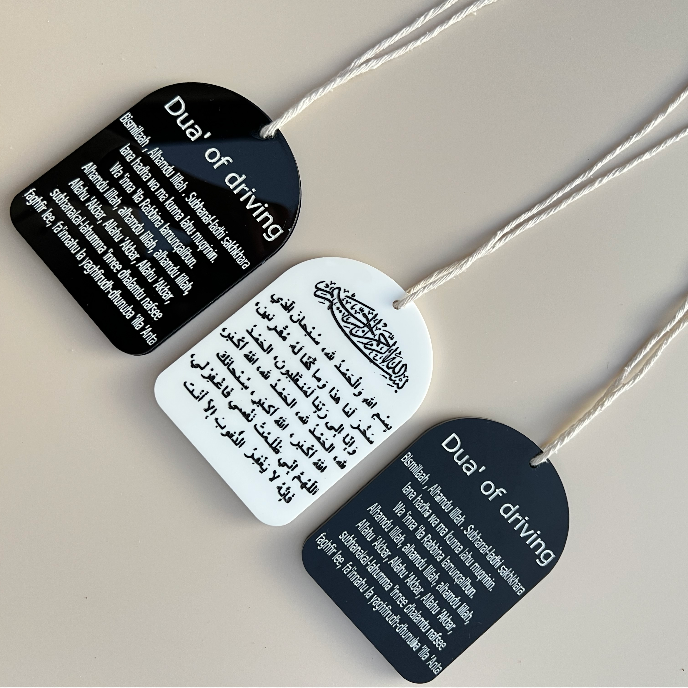 A double sided dua car hanger plaque with the ‘dua of driving’ on one side in English and the other side in Arabic. Hang this accessory on your rear view mirror as a reminder to recite before driving a car and inshallah Allah will protect.