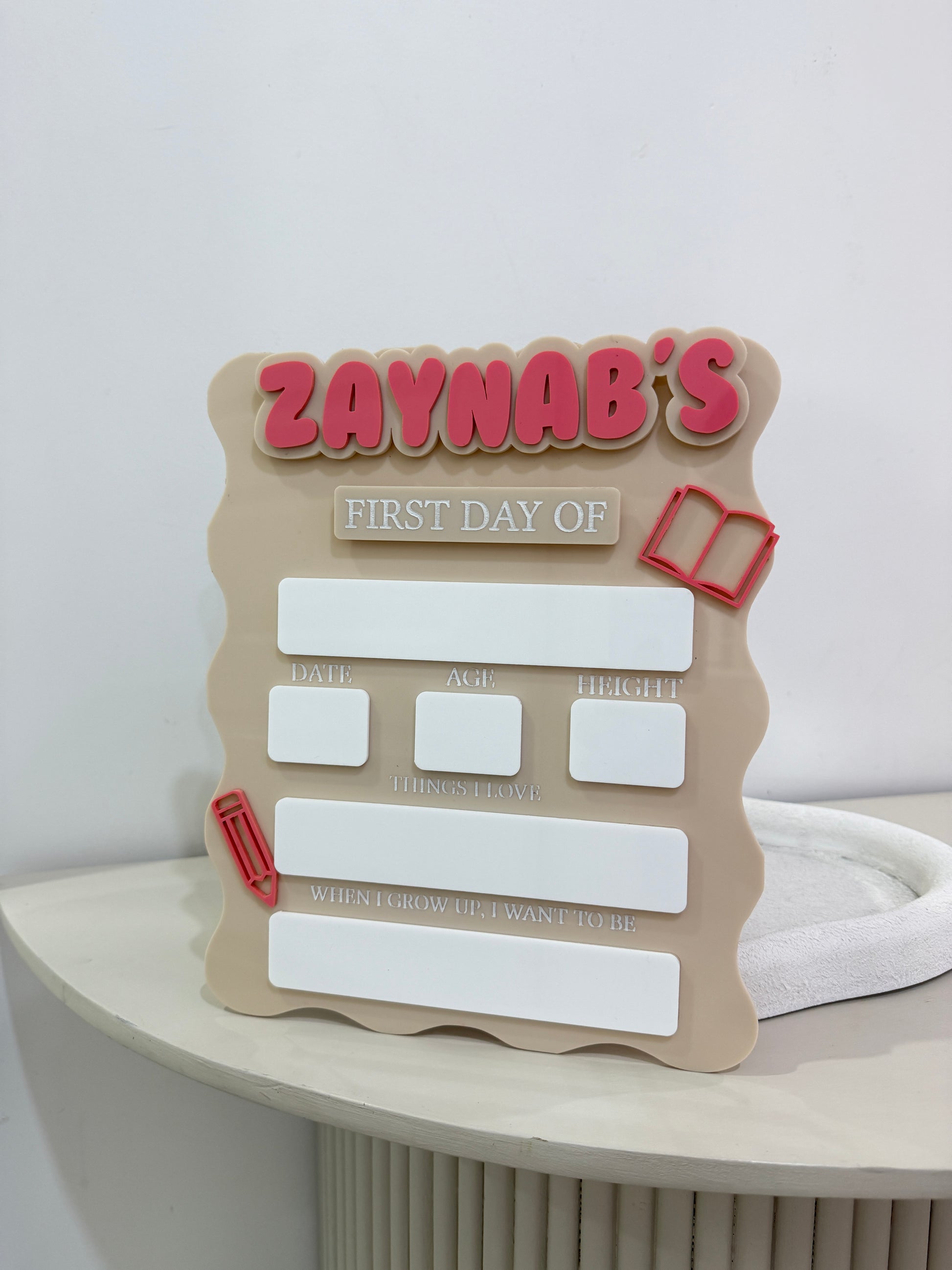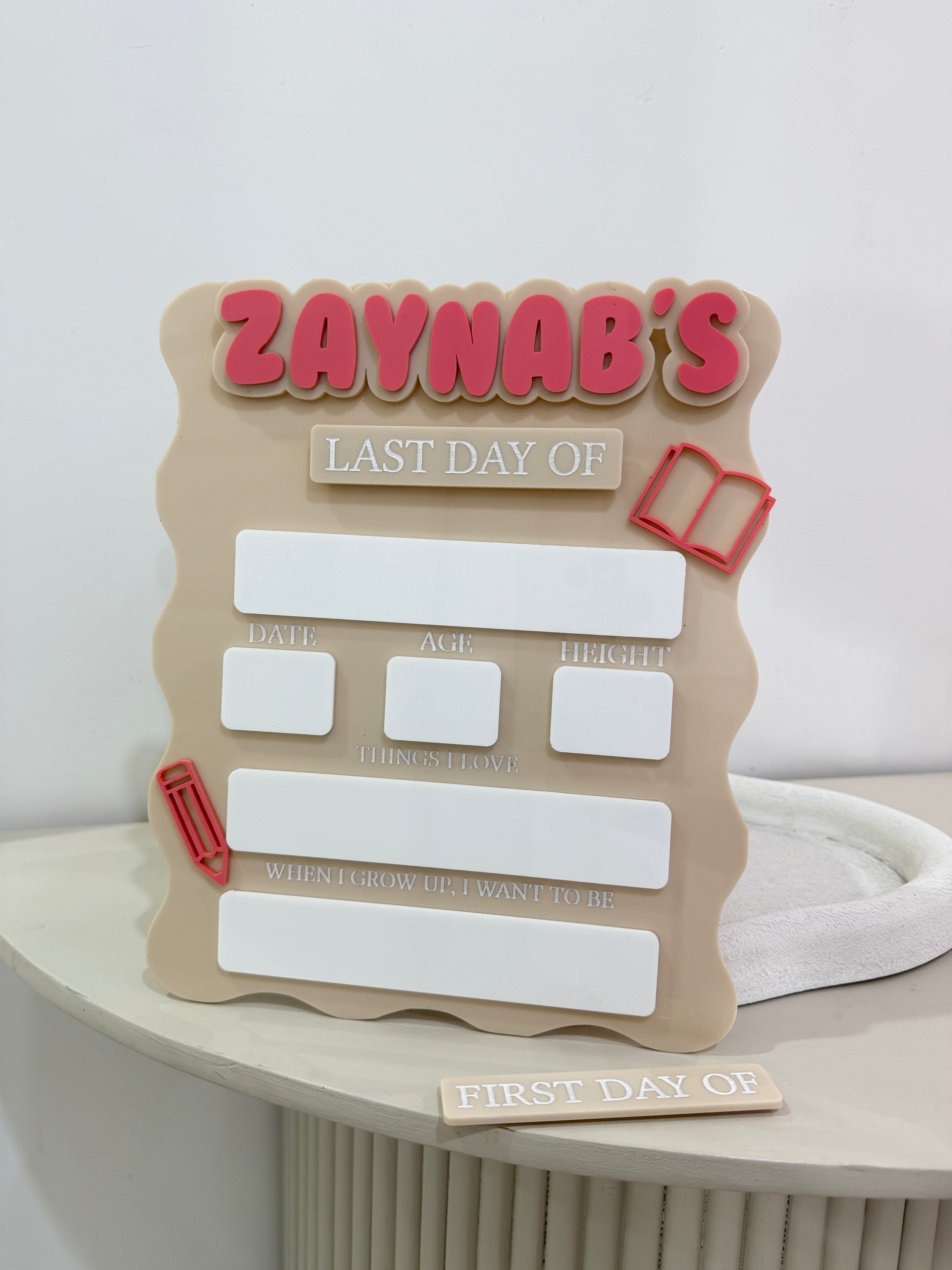 Capture your child’s first and last day of school with our interchangeable ‘First day of’ plaque. Writing their details with a black whiteboard marker and simply rubbing it off after to re use again. Choose from your choice of acrylic board and 3mm acrylic wording. A gorgeous keepsake piece to always cherish.
