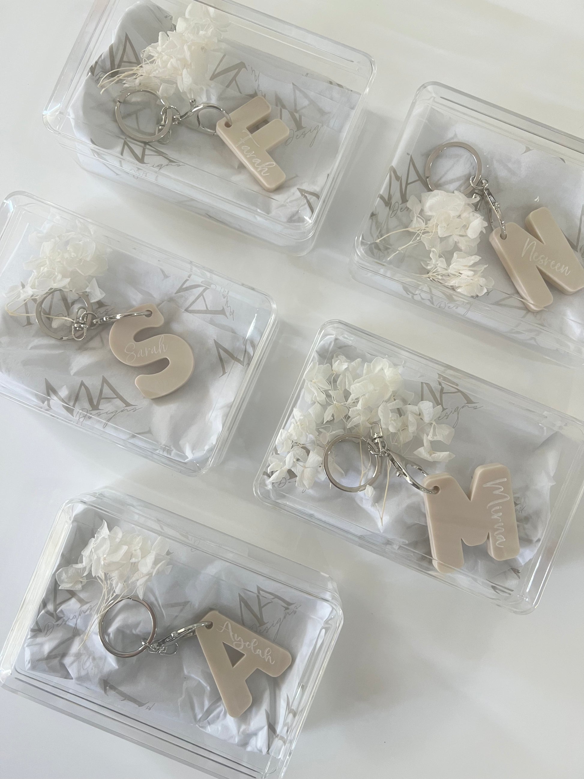 Dimensions: All initial key rings have a height of 6 cm and the width is based on the letter of the name.