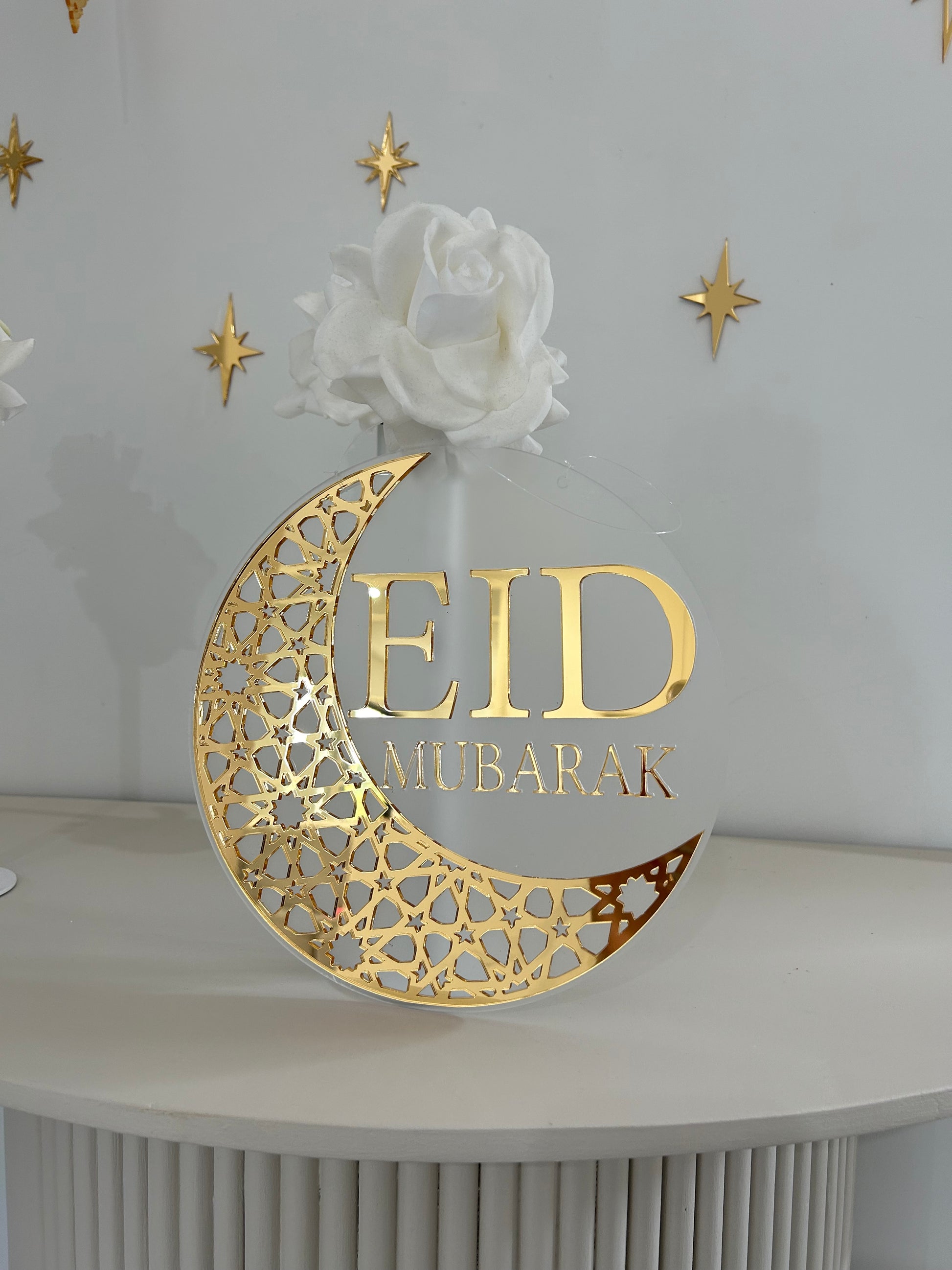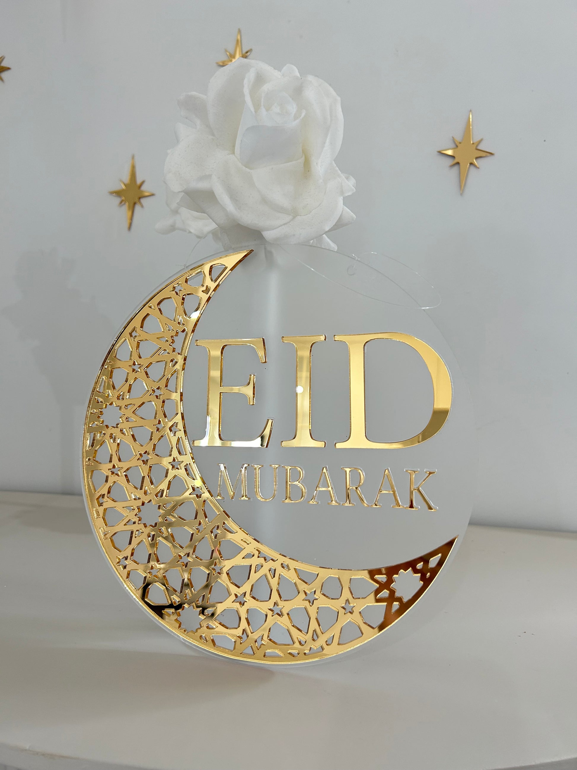 Welcome your guests this Ramadan and Eid with our Moon door sign. With two holes and an invisible like rope, this door sign will make the perfect piece to hang on your door and/or entryway.
