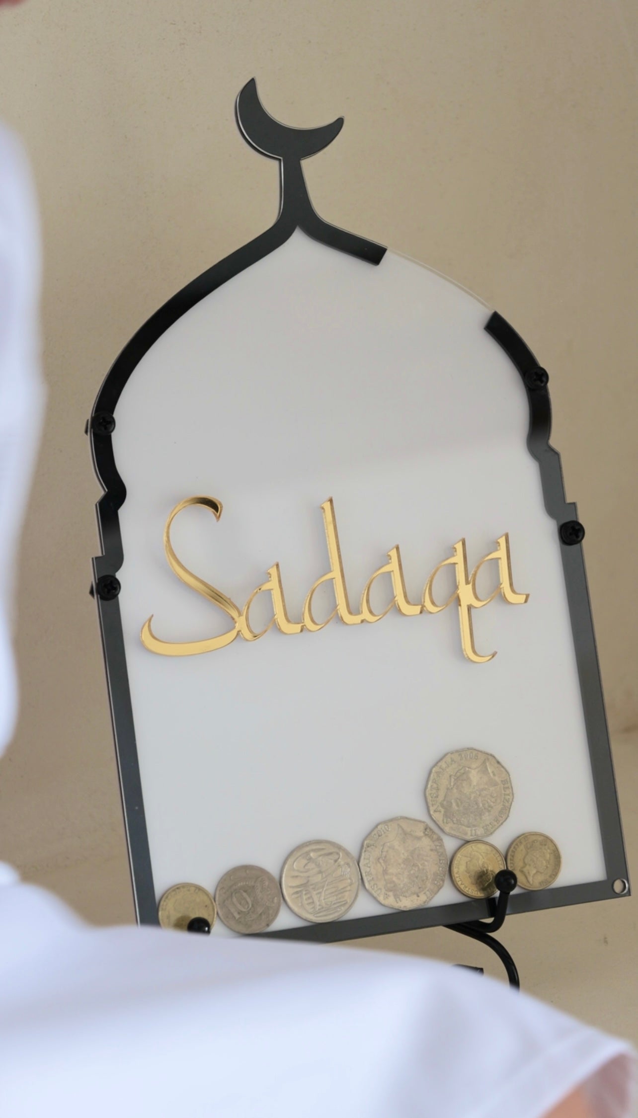 An Acrylic based sadaqa jar which features 3 layers of acrylic, a base layer, border layer and clear acrylic top. The 3 layers are secured on via 6 black screws. The border outline is black so it will not show the screws from Afar.